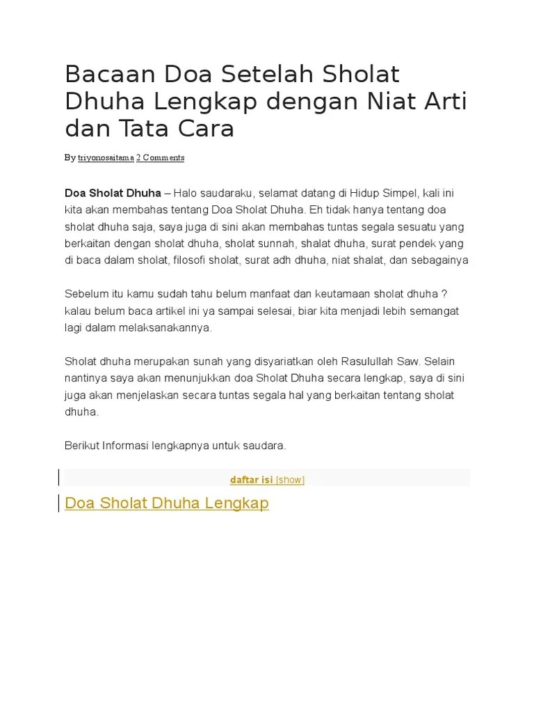 Ushalli sunnatad dhuhā rak'ataini lillāhi ta'ālā. Aku niat shalat sunat dhuha dua raka'at, karena allah ta'ala. Sholat dhuha merupakan salah satu sholat sunnah yang dikerjakan saat matahari sedang naik. Sholat dhuha termasuk salah satu ibadah sunnah yang sangat dianjurkan untuk umat muslim. Sehabis sholat dhuha kita diharuskan membaca doa. Artinya, aku menyengaja salat sunah duha dua rakaat karena allah swt. 2. Kalau masing bingung membacanya berikut bacaan latinnya. Bacaan doa setelah shalat dhuha. Doa sholat dhuha lengkap latin.